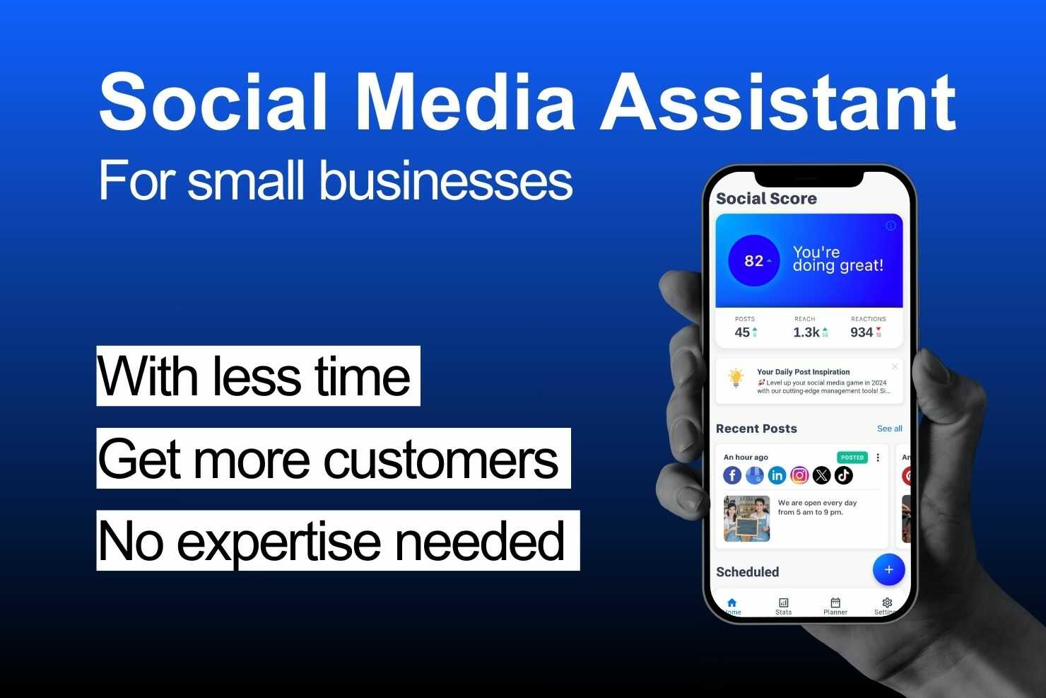 As a small business starting out, this helps me so much. It saves me a lot of time with posting on social media. I don't have to sit there and copy and paste my posts to each platform. It's super easy to use, and the content suggestions make coming up with posts easier!