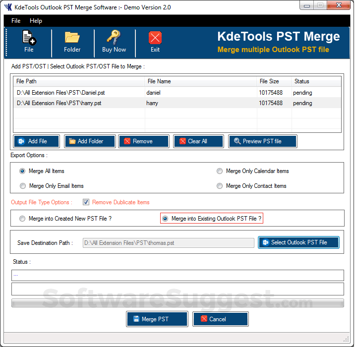 KDETools Outlook PST Merge software can easily merge multiple Outlook files into a single PST file. This tool merges files with all PST items like emails, calendars, tasks, notes, etc.