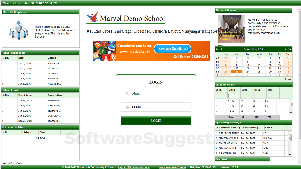 MarvelSoft focuses on becoming a complete Software Solutions provider for Schools and Educational Institutions. MarvelSoft's SchoolAdmin software can manage various data and tasks, namely Student Information, Fees Management, Student and Staff Attendance, Parent Login, Library Management, and Transport Management.