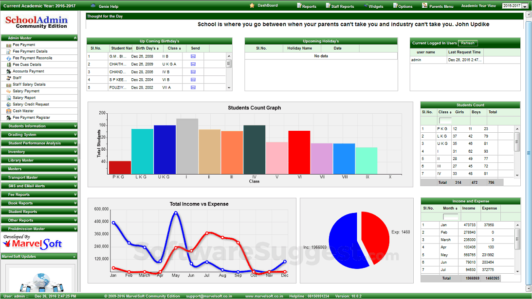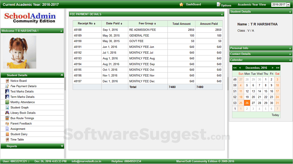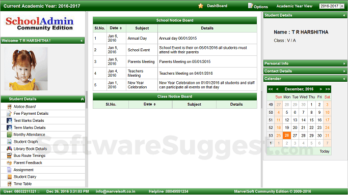 Marvelsoft's SchoolAdmin is a complete solution to manage school administration. Right from storing the student details during the admission to managing their progress till the TC procedure all the activities can be managed in SchoolAdmin.