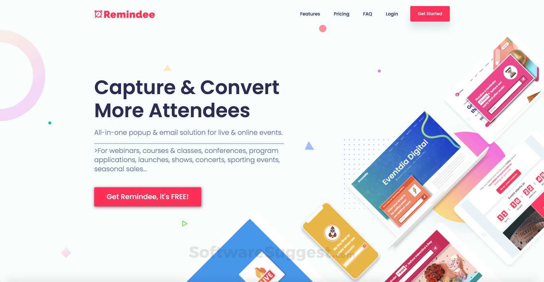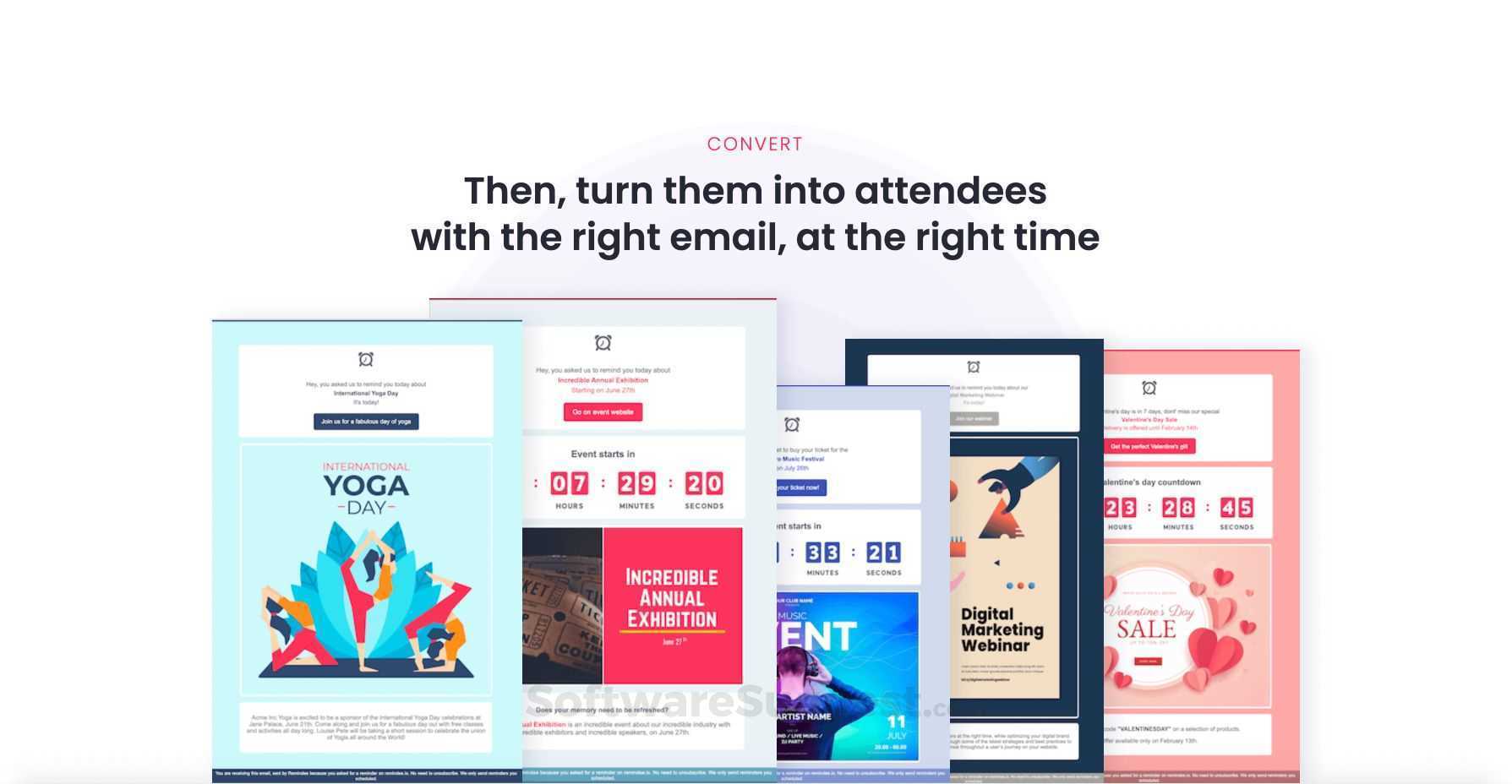 Remindee is for webinars, courses & classes, conferences, program applications, launches, shows, concerts, sporting events, seasonal sales...