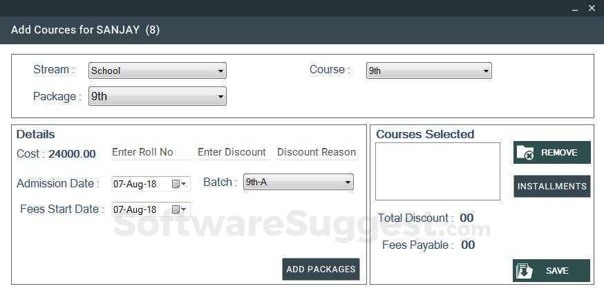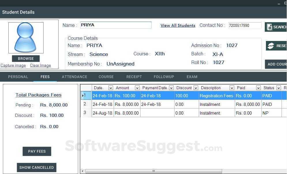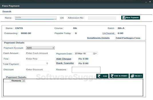 - Print receipts and track Fees, Discounts, Installments, Receipts, Service tax, outstanding amount, and overdue amount. Fees can be collected
