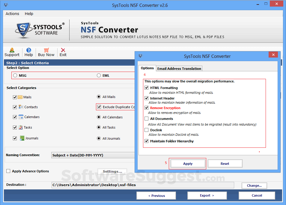 SysTools NSF Converter allows users to export NSF files to EML and MSG formats. Using this application, users can migrate entire mailbox data such as emails, contacts, calendars, journals, etc. Moreover, there is no file size limitation while performing the conversion.