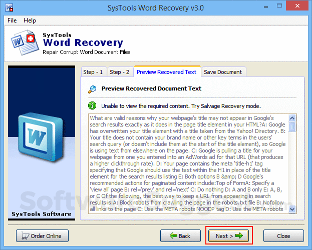 - Salvage Recovery- In case if Word file is highly corrupted the user can opt this recovery option.