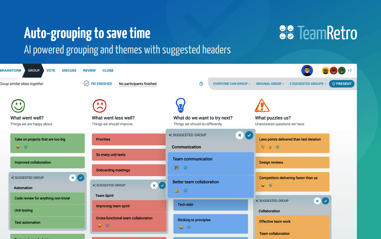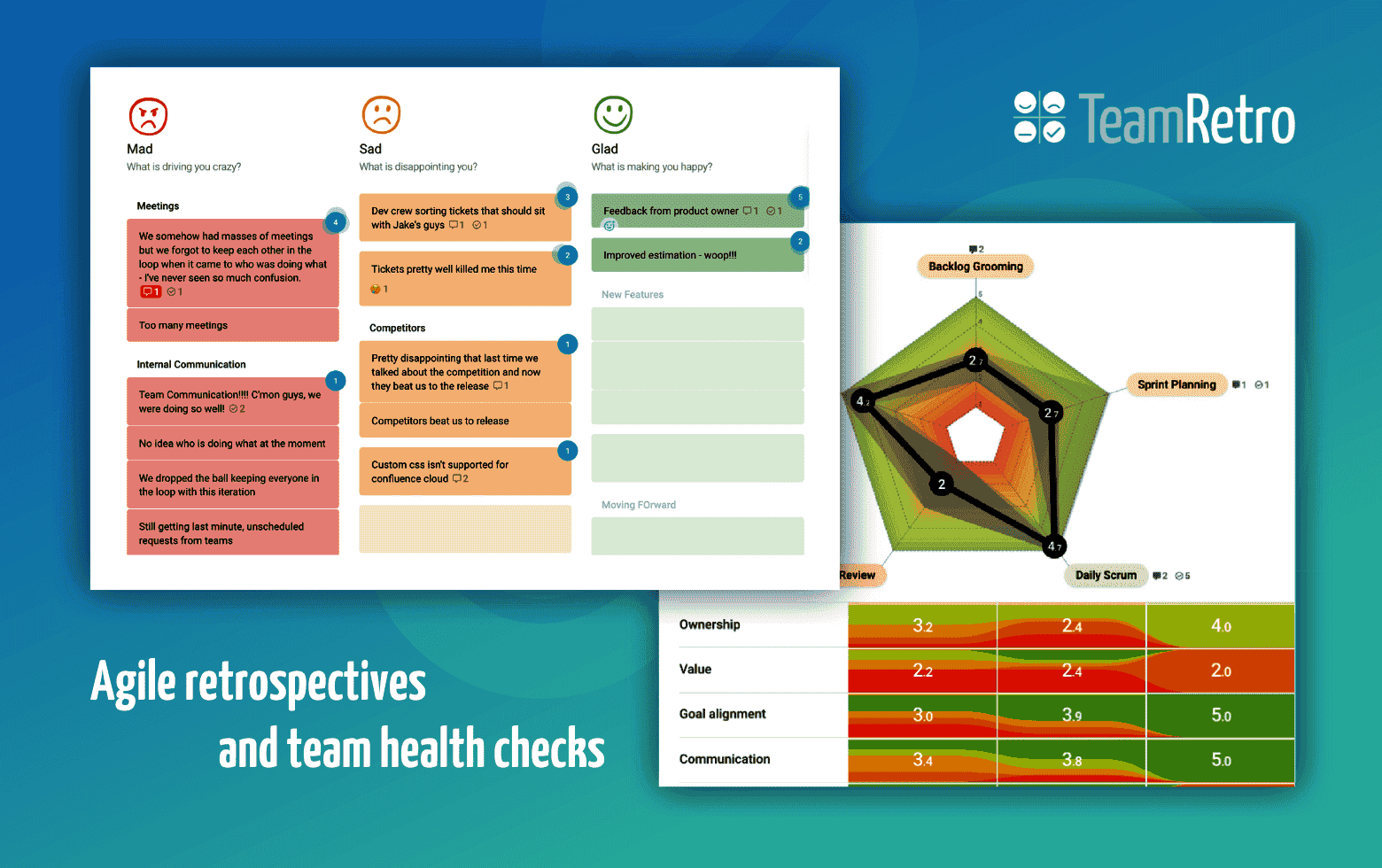 Say goodbye to time-wasting, boring and ineffective retrospectives TeamRetro gives scrum-masters, agile coaches and teams a safe space to ideate, gather inspiration and foster a collaborative spirit.