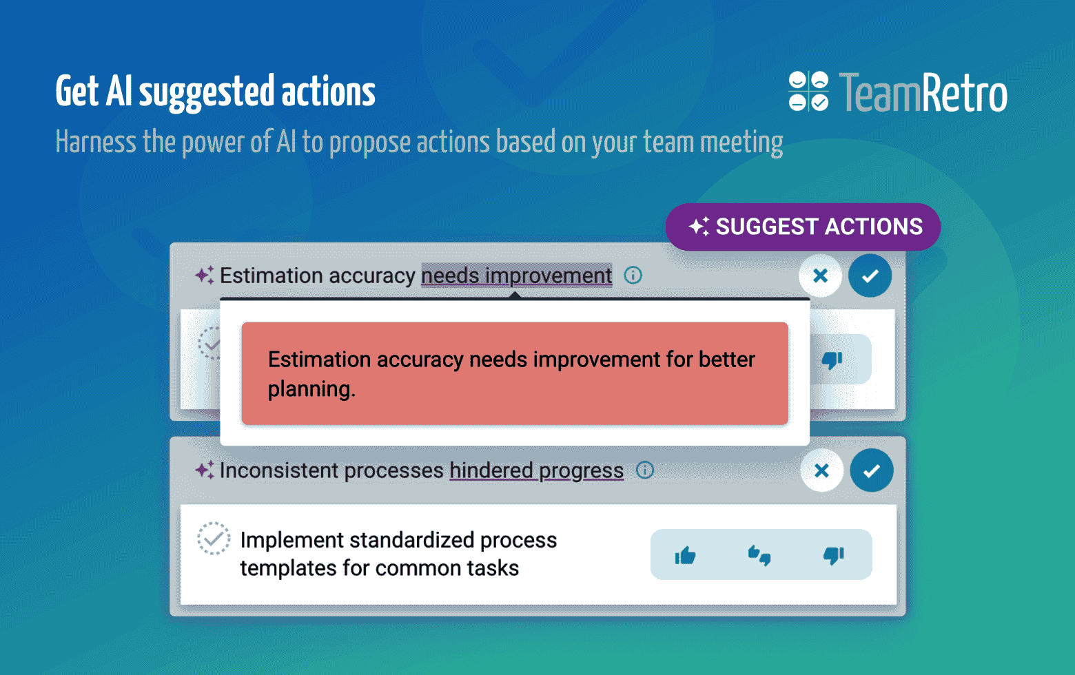 Turning insights into improvements is simple. Teams or AI can propose actions, which can be accepted or refined, then assigned with due dates and owners. Actions carry forward from meeting to meeting and can be tracked directly in your workflow tools. With integrations to 15+ platforms—including Jira, Slack, Confluence, Microsoft Teams, GitHub, Trello, and Basecamp—TeamRetro fits seamlessly into your delivery pipeline.