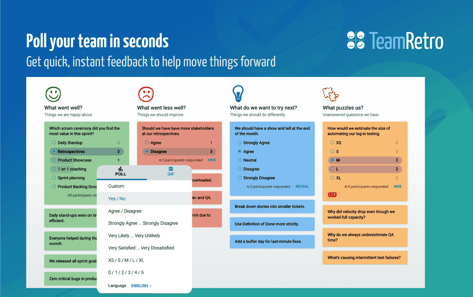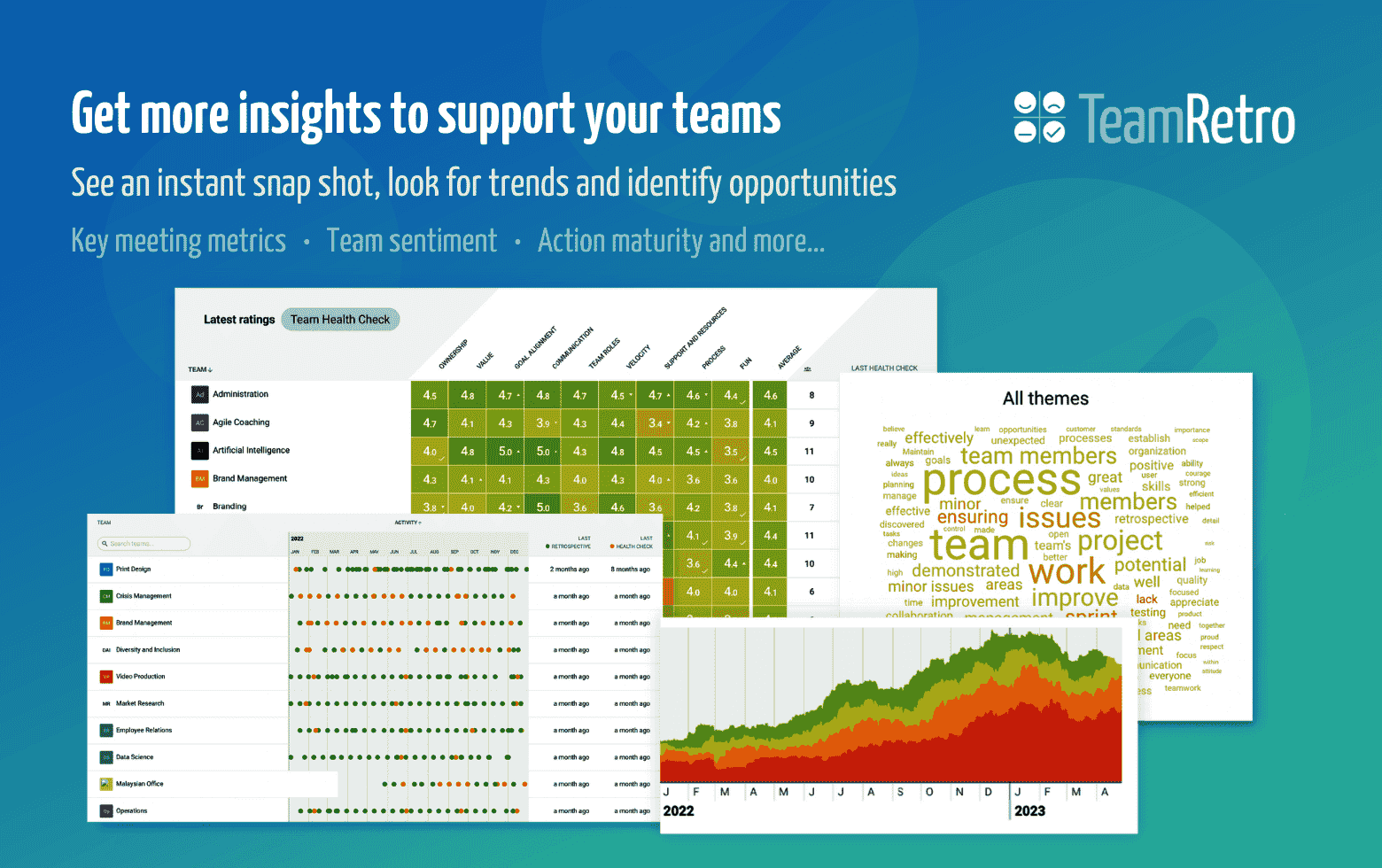 Outcomes are easy to share. Instant summaries highlight key discussions and top-voted items, while interactive dashboards transform qualitative feedback into clear visual data. AI-powered insights reveal sentiment, themes, and hot topics over time, while trend charts and heat maps track team health across iterations. For larger organizations, cross-team analysis makes it possible to identify risks, patterns, and opportunities at scale.