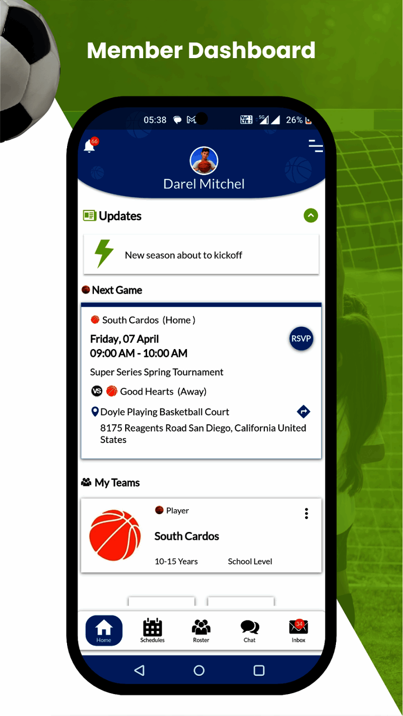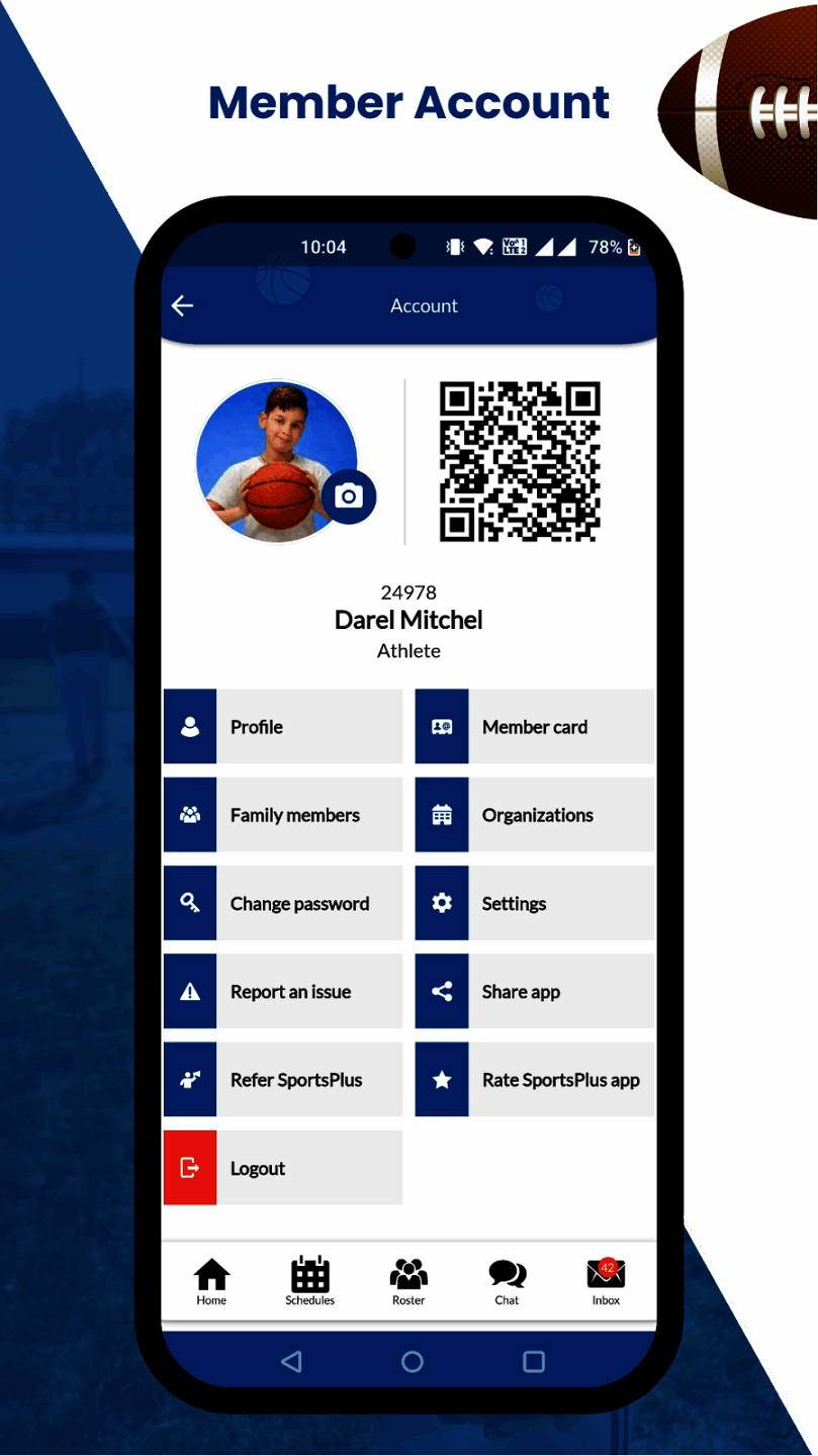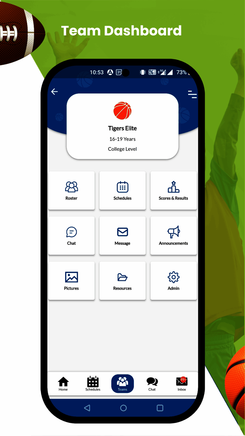 athlete, team, and organization management. The app allows monitoring of athletic performance, schedule management, and network.